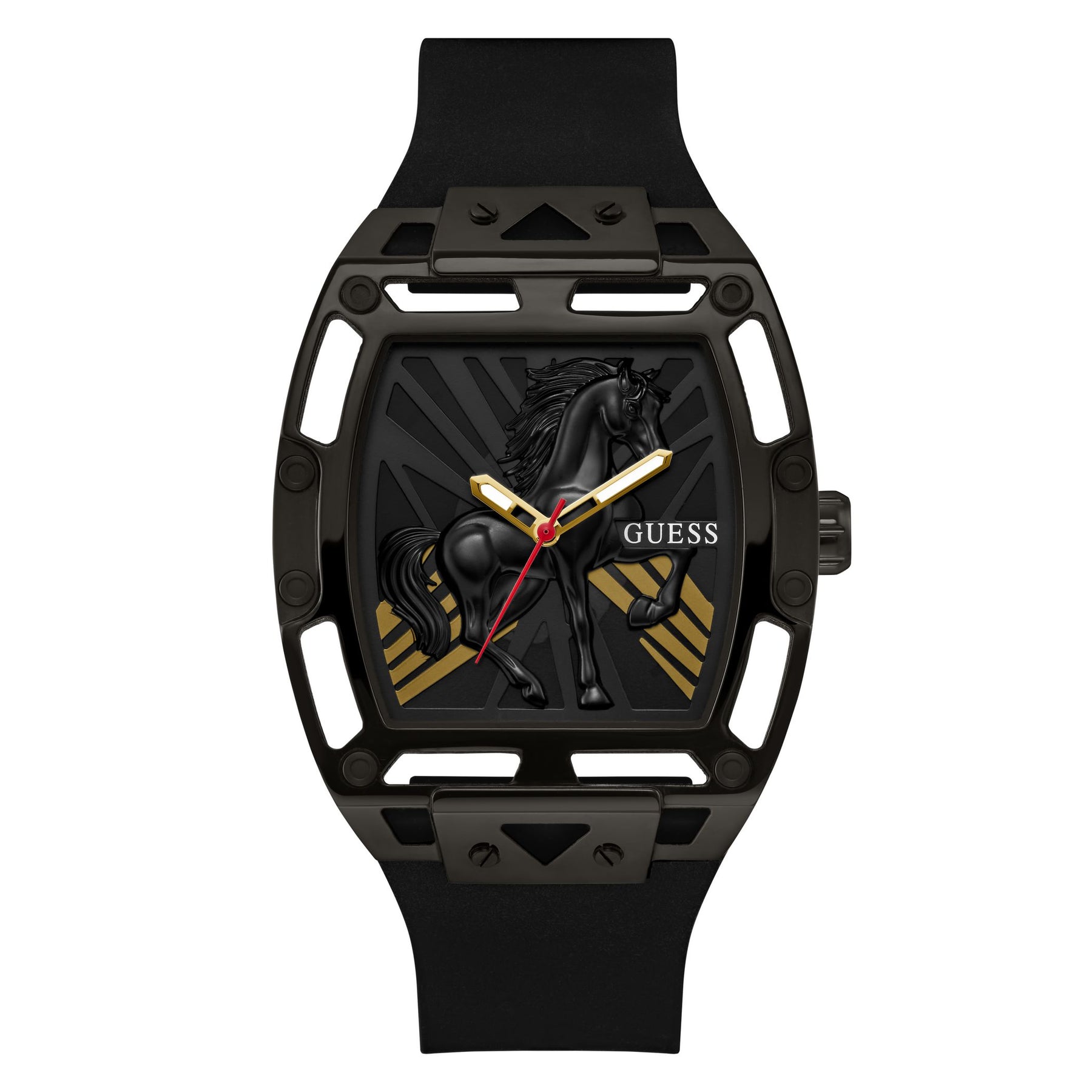This 44 mm rectangular statement piece, crafted in our best-selling tonneau-shaped case, brings bold energy and a confident silhouette to the wrist in a sleek black stainless steel paired with a matching black silicone strap.