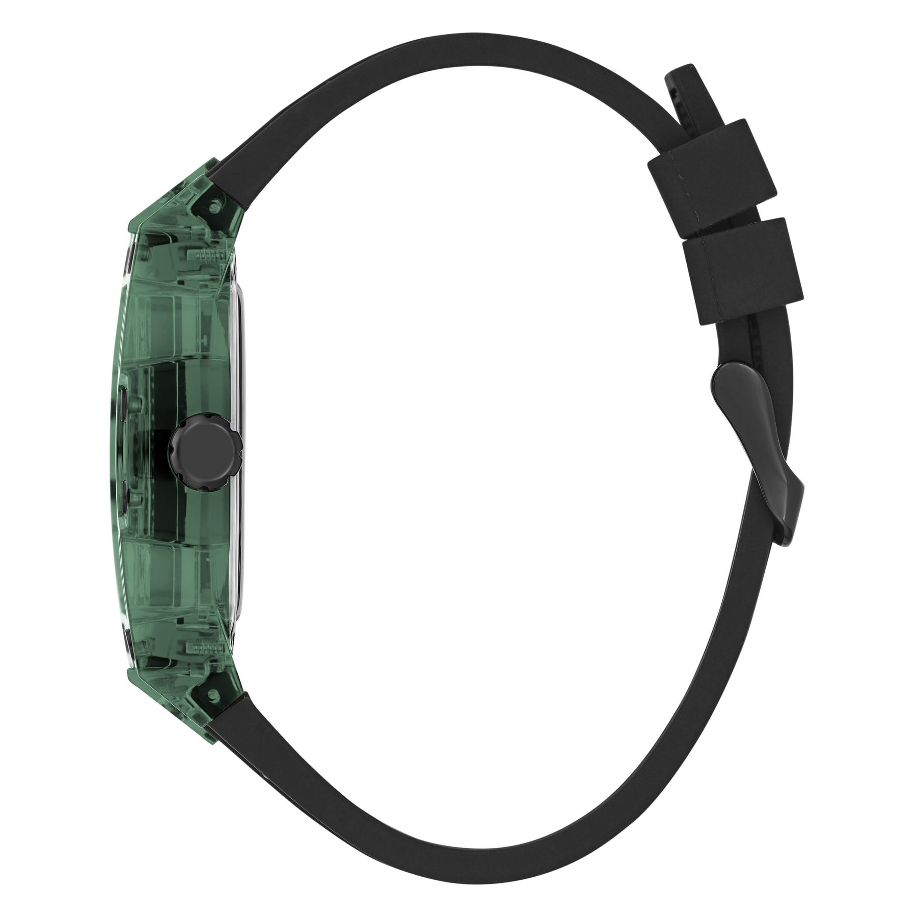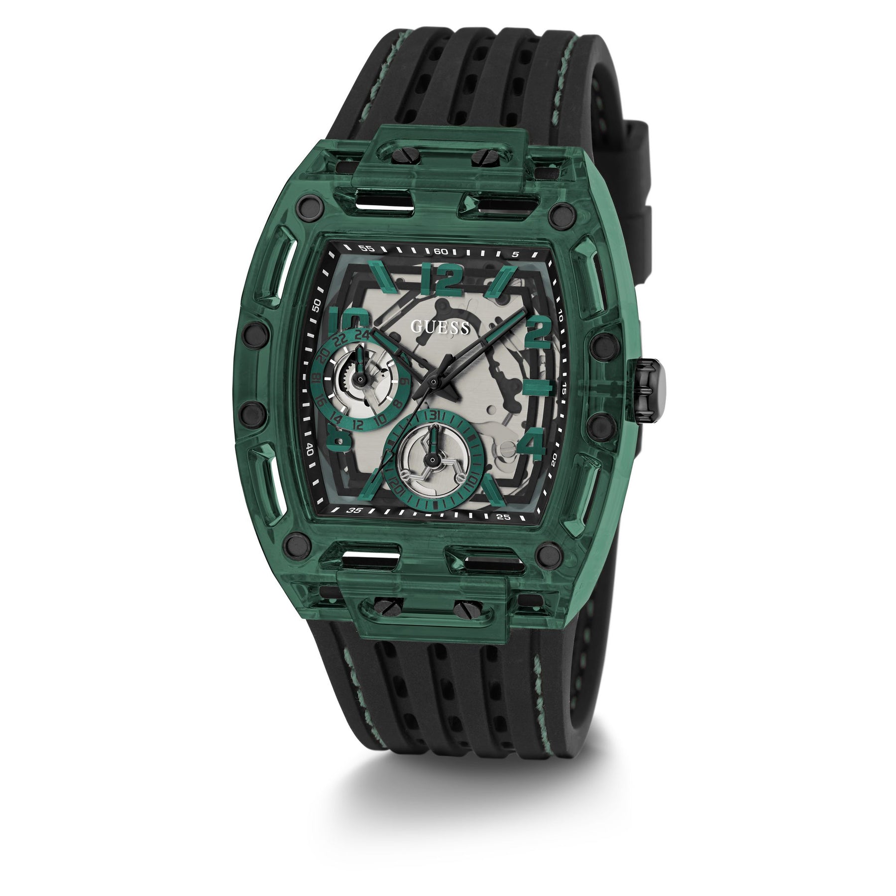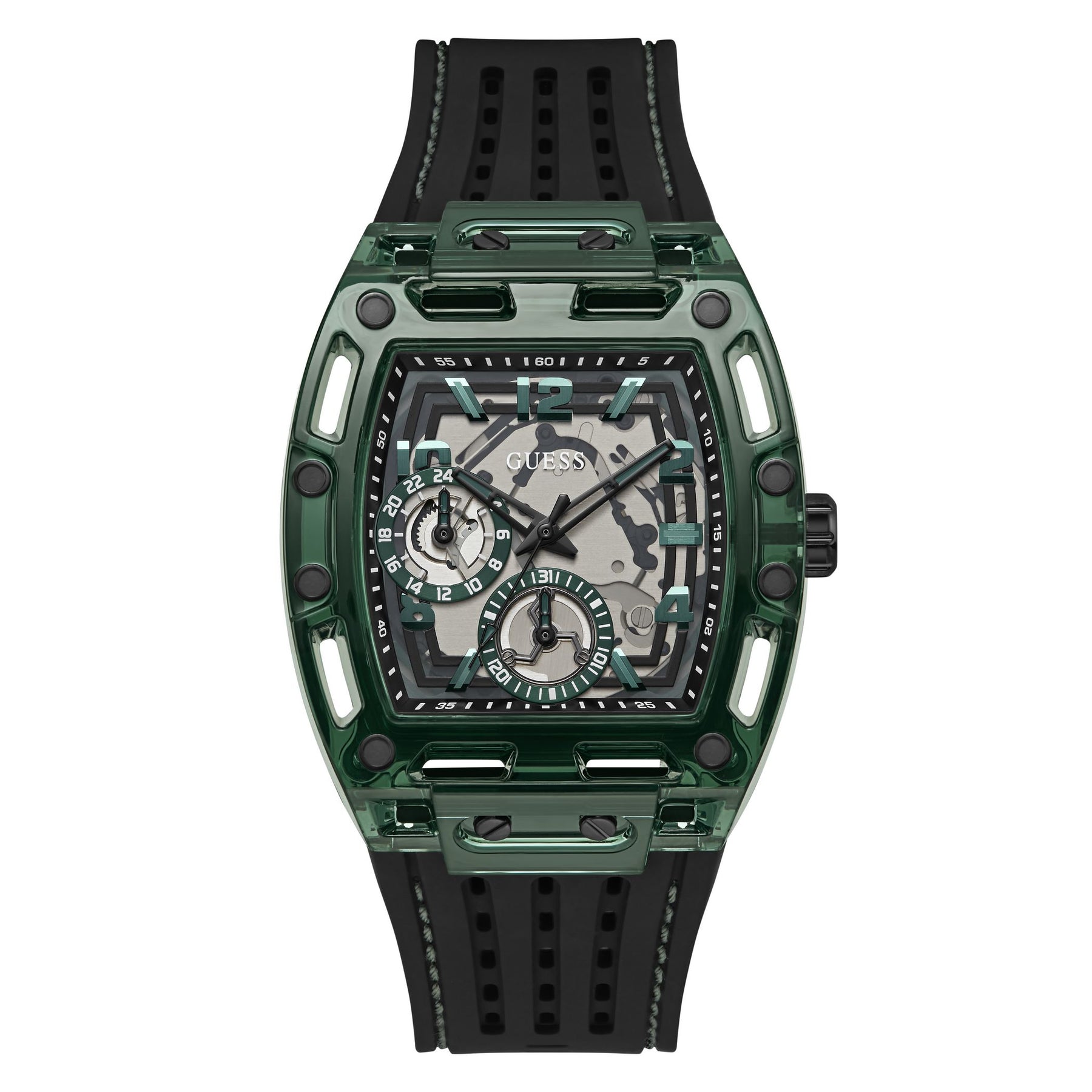 Skeleton dial details keep this phoenix on the rise. This style features a polycarbonate cut-thru barrel shaped case with black screw details and a cut-thru multi-function dial paired with a silicone strap with contrast stitching.