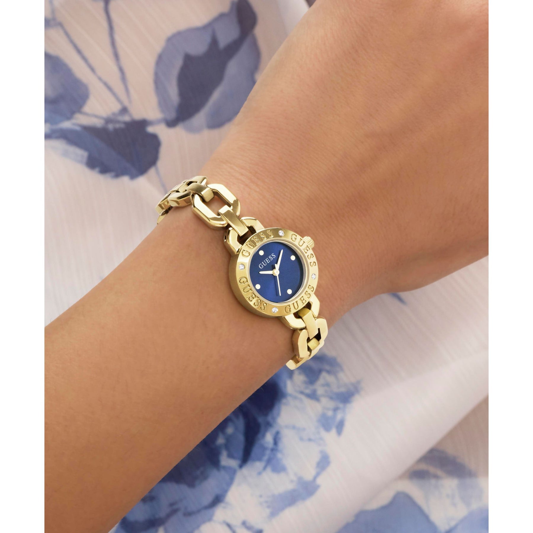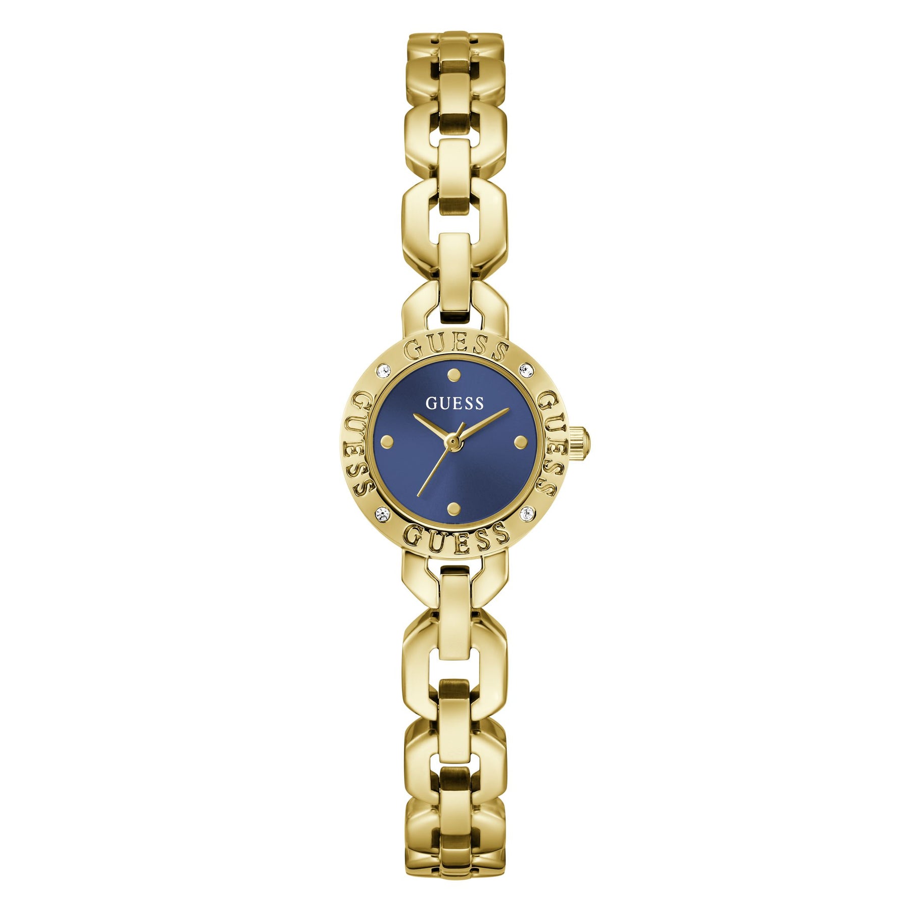 Petite, polished and impossible to overlook, Siren brings a new level of allure to a 23 mm silhouette. The polished gold-tone case features a crystal-accented GUESS logo bezel that draws the eye towards the deep blue sunray dial.