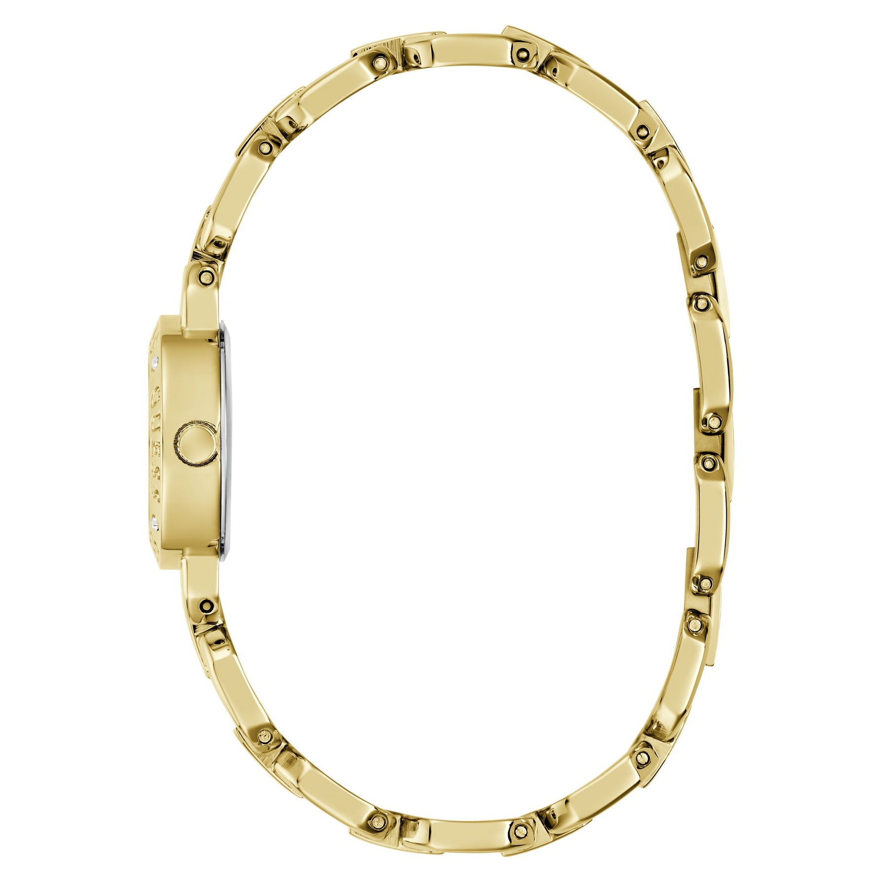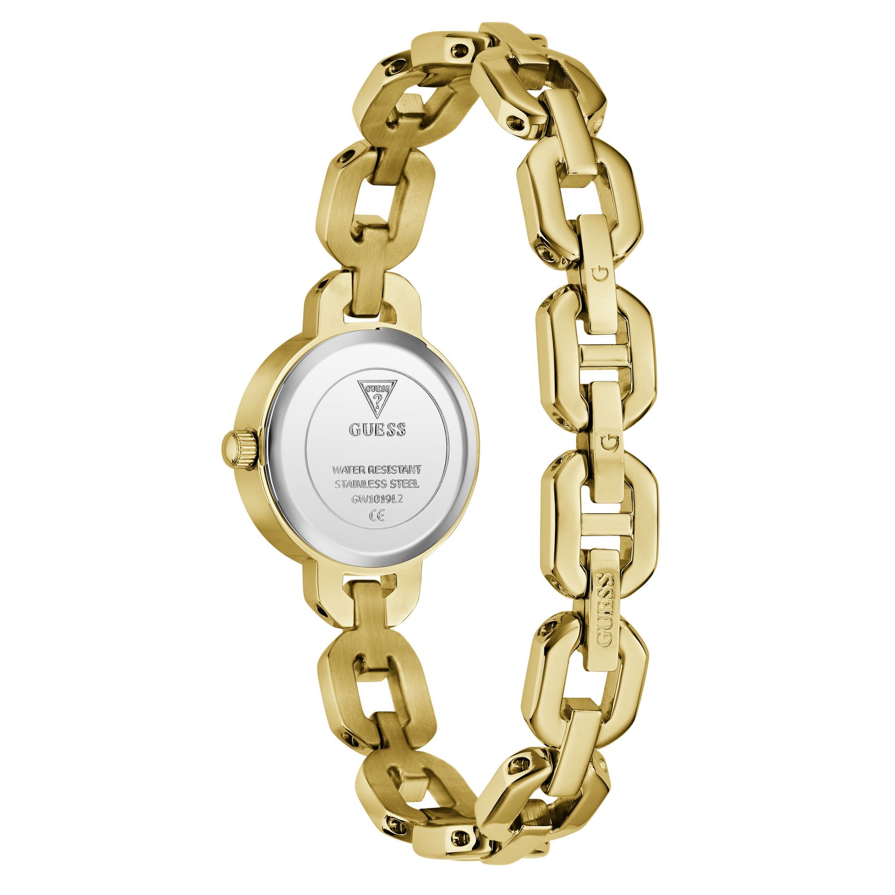 A matching gold-tone bracelet completes the look with sleek chain links and self-adjustable G-links that create a smooth fit. The refined finish, soft color palette and radiant dial come together to create a balance of charm and edge.