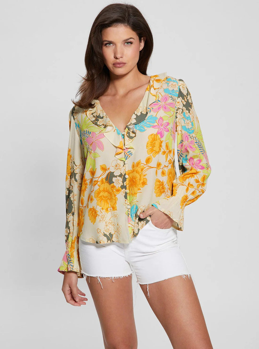 Add some sunshine to your wardrobe with our Eco Yellow Floral Print Toni Top. This top features long sleeves, a flattering v-neckline, and an easy button up closure. Perfect for any occasion, it's sure to become your go-to choice.